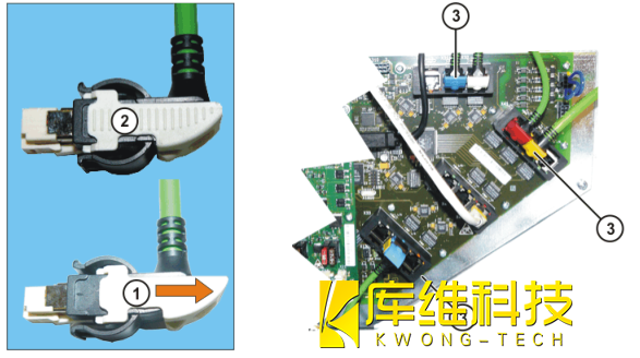 1. 關閉控制系統(tǒng)并采取確安措施防止未經授權的重啟2. 將數(shù)據(jù)線插頭解鎖拔出控制柜 (CCU ) 上的所有接線解鎖數(shù)據(jù)線插頭如下圖