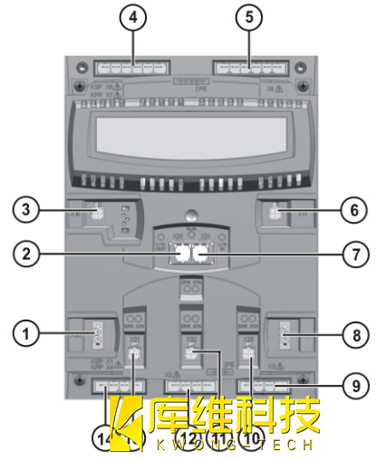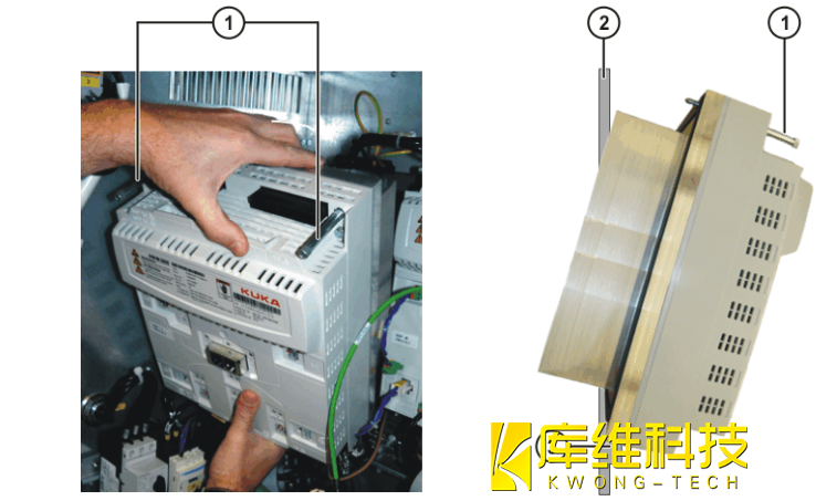 注意:KPP 的重量約為 10 kg. 在 KPP 的拆裝工作中存在擠傷危險(xiǎn)!請(qǐng)戴防護(hù)手套5. 將新的 KPP 插進(jìn)殼體支撐角鐵 (3)里,然后將其上部掛入角鐵并擰緊(擰緊扭矩 4 Nm)6. 按照插頭和線纜說明將所有接口插入. 將插頭 X20 和 X21 鎖緊.